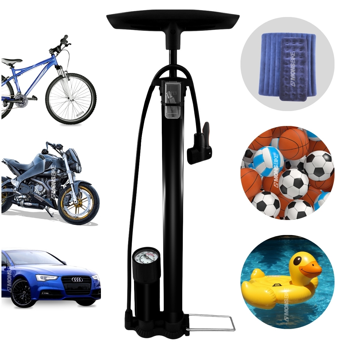 Ideal para encher pneus de bicicleta, carro, moto, bola, colchão inflável, bóia, e outros infláveis.
